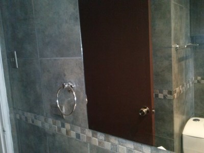 Cerámica en muro y vanitorio, todo decorado con listel envidriado