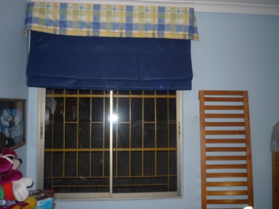 Store, en tela Chintz, color azul, con cenefa que cubre soporte